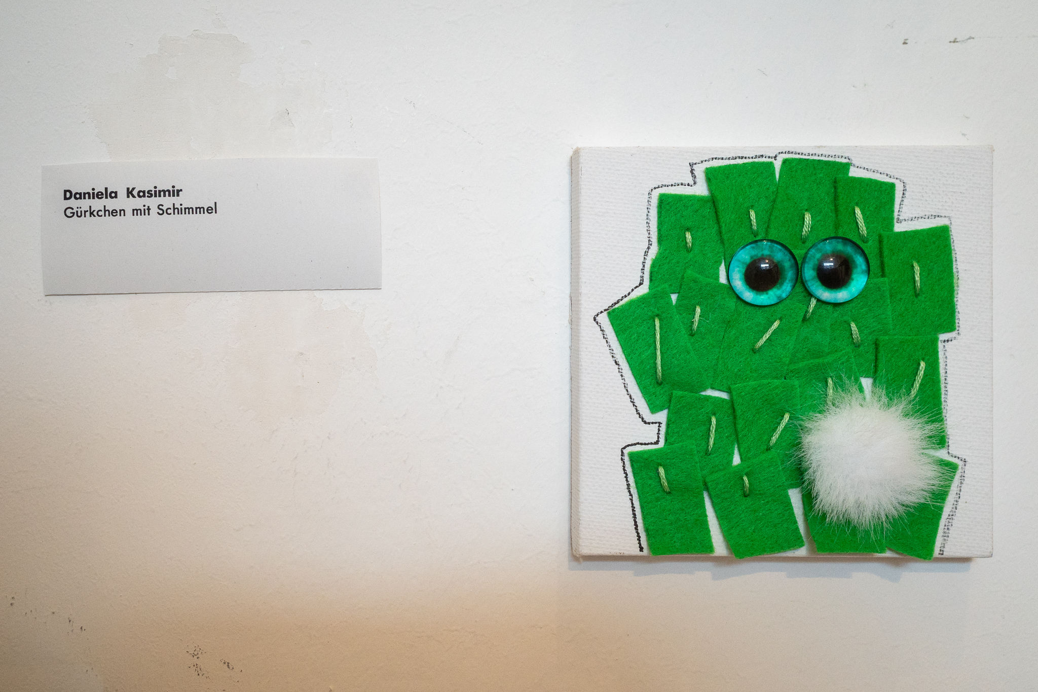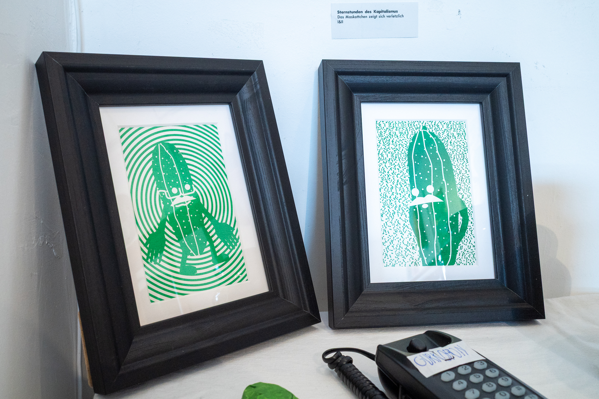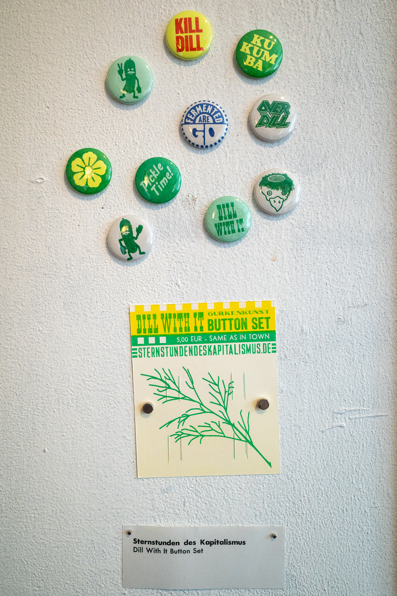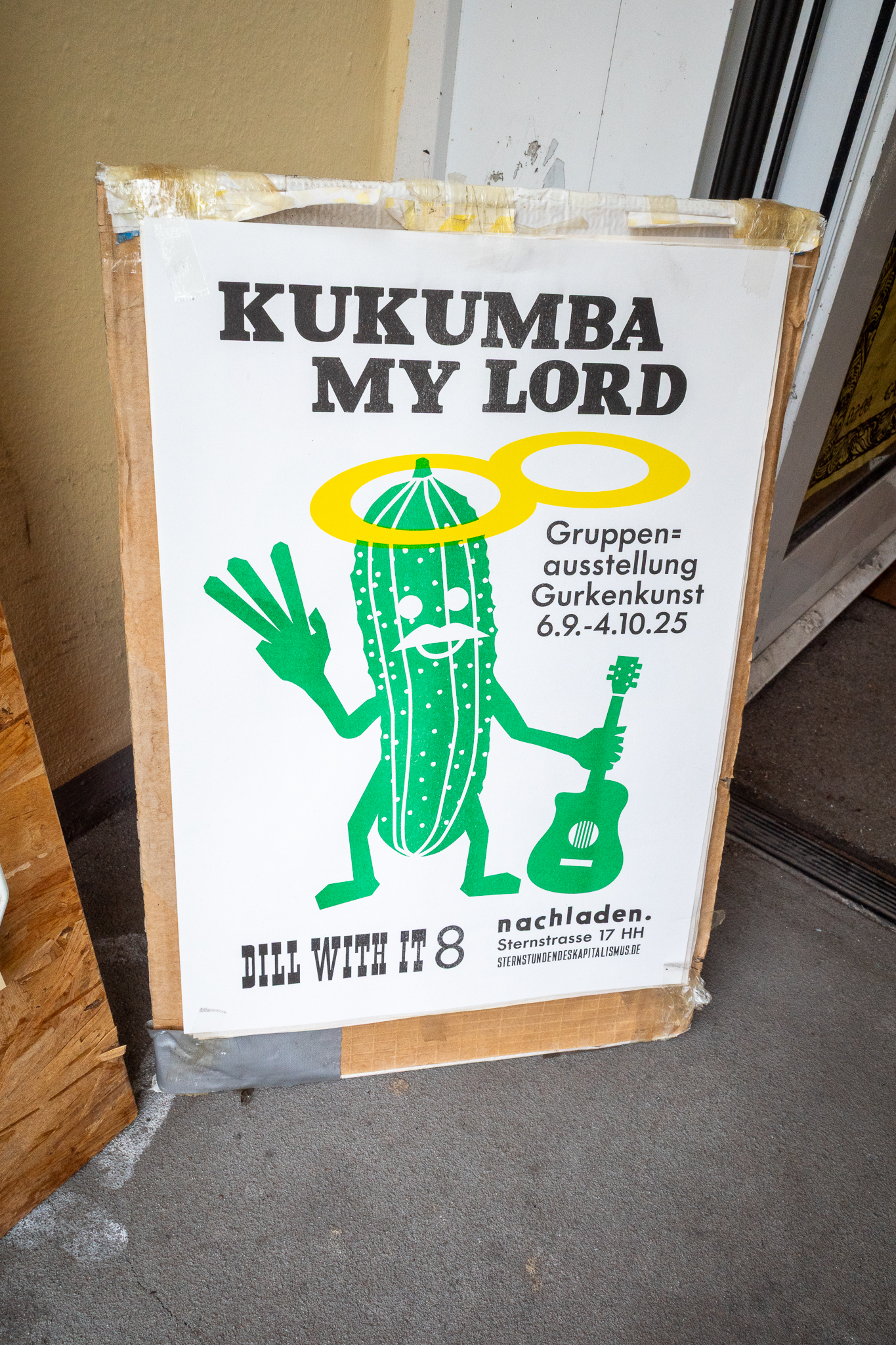 Kukumba My Lord – Dill With It 8 Gruppenausstellung von Gurkenkunst im Nachladen (Sternstraße 17, Hamburg), 06.09.–04.10.2025 Kukumba My Lord – Dill with it 8 Außenansicht des Nachladen am 10.09.2025 Andreas Czech – St. Cucumber Anna Fight – Pickle Sisters mit Sonntagsbraten Biljana Tomic – Santa Kukumba Bernd Spyra – Sturm im Gurkenglas Camila Machado – oT Camila Machado – oT Dada Reinhardt – Kukumba Dots Due Duci – Gurkenmann auf Gurke Daniela Kasimir – Gürkchen mit Schimmel Elisabeth K – „Dauxi Defekt mit Ente und Gurke“ (Foto Anja S.) FrauKe – oT Hans Braumüller – Heimat-BRD Harald Retzbach – Gurken + Glas Hysterical Times – The Art of the Dill Intelligenzbolzen – Gurkin Bag Johanna Königsberger – Gurken im System Julius Wagner – Gurkofon Kai Cassuben – oT Karin Hoefling – Big Dillover (Marx) Lana Bragin – Gurkenbunki Mana Schmidt – oT Marie Hamm – Pink Manta Nicola Hardy – Pickle Power Stefanie Rausch – Caught in the Act Sternstunden des Kapitalismus – Das Maskottchen zeigt sich verletzlich I&II Sternstunden des Kapitalismus – Dill With It Button Set Marti – oT Suchtdruck – Arbeiter und Spreewaldbäuerin
